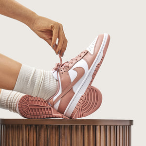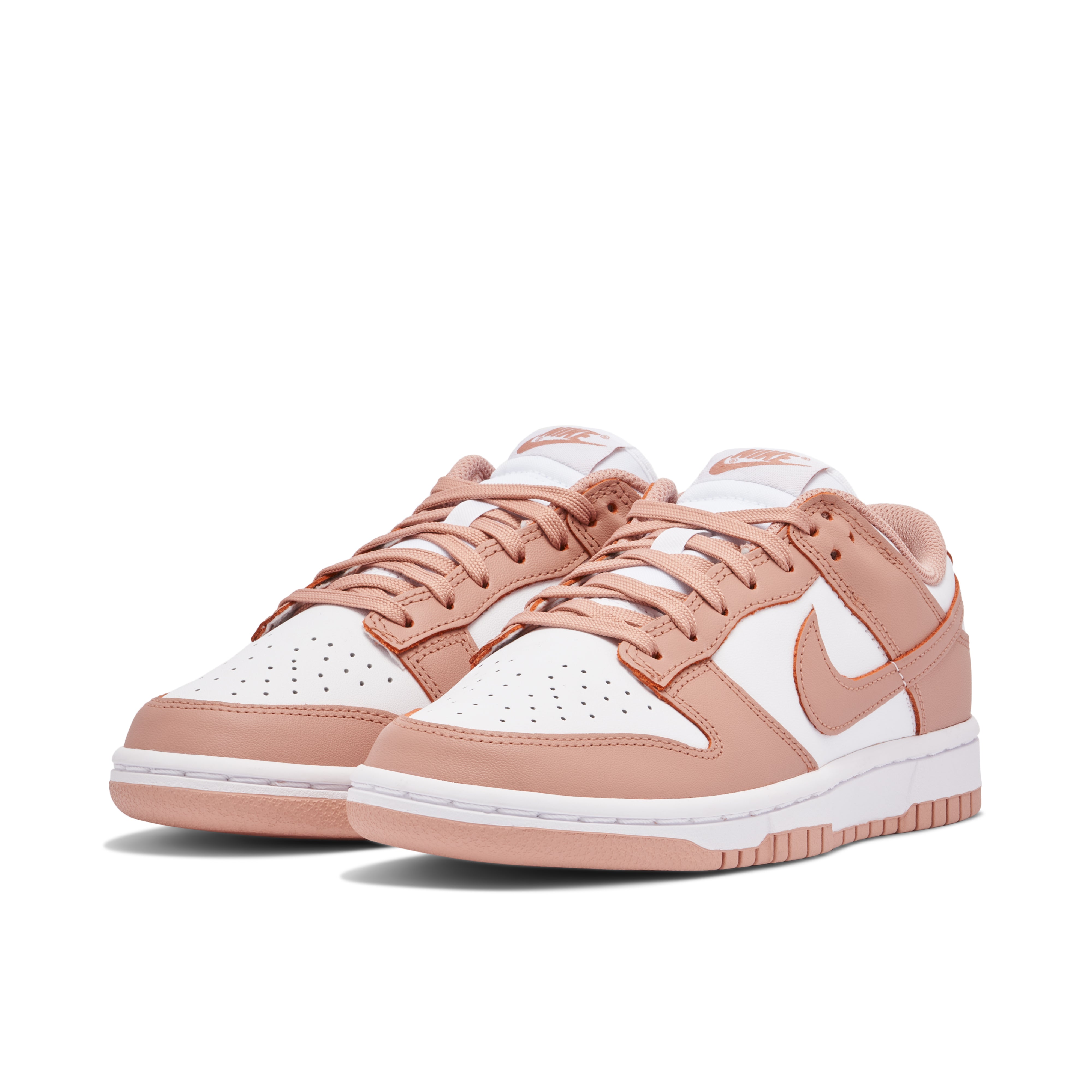 The Nike Dunk Low Rose Whisper Womens exudes elegance with its subtle rose and white palette. Crafted from premium leather, this sneaker showcases the iconic Nike Swoosh in whisper-soft pink. The toe box features classic perforations for breathability, while the padded collar and cushioned midsole ensure ultimate comfort and support. Durable rubber outsole provides excellent grip and traction. Perfect for streetwear enthusiasts, these trainers elegantly blend sporty flair with casual sophistication, effortlessly complementing various styles from athleisure to chic urban outfits.